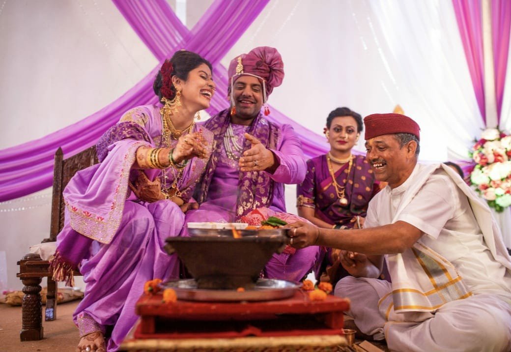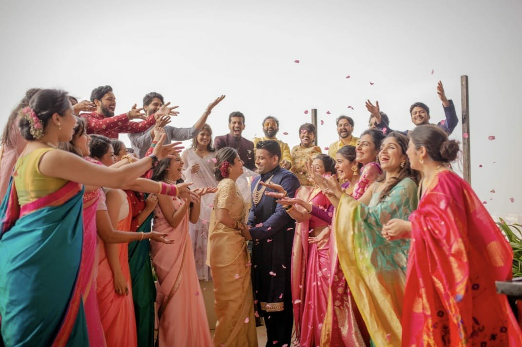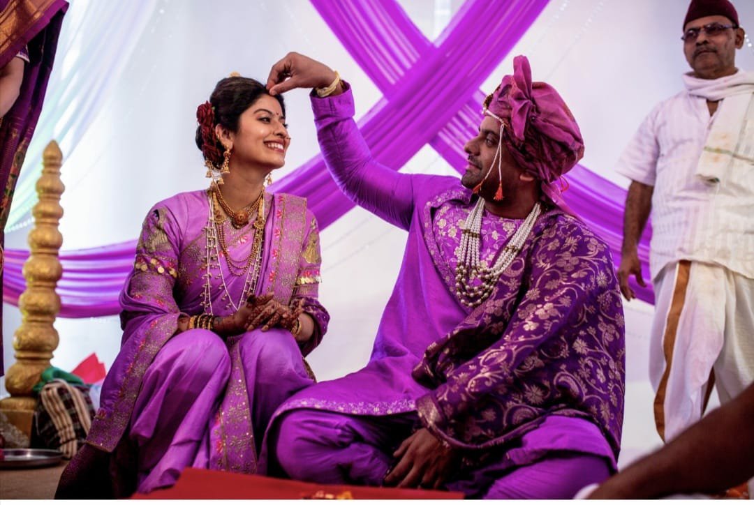 लग्न विधीसाठी परंपरेचे पावित्र्य अधोरेखित करत अभिनेत्री अभिज्ञा भावेने तष्ट हाऊसने डिझाईन केलेली कमळाचे नक्षीकाम असलेली भरजरी हँडवर्क सिल्क साडी नेसली होती. तर नवरदेव मेहुल पैने अभिज्ञाच्या सिल्क साडीला शोभेल असा अंगरखा घालून त्यावर निळा शेला आणि फ्लोरल ऑर्गांझा कपड्याचा फेटा परिधान केला होता. या लक्ष्मी नारायणाच्या जोडीचे कौतुक तर झालेच पण त्यांनी परिधान केलेल्या कपड्यांनी त्यांना अधिक आकर्षक बनवले.