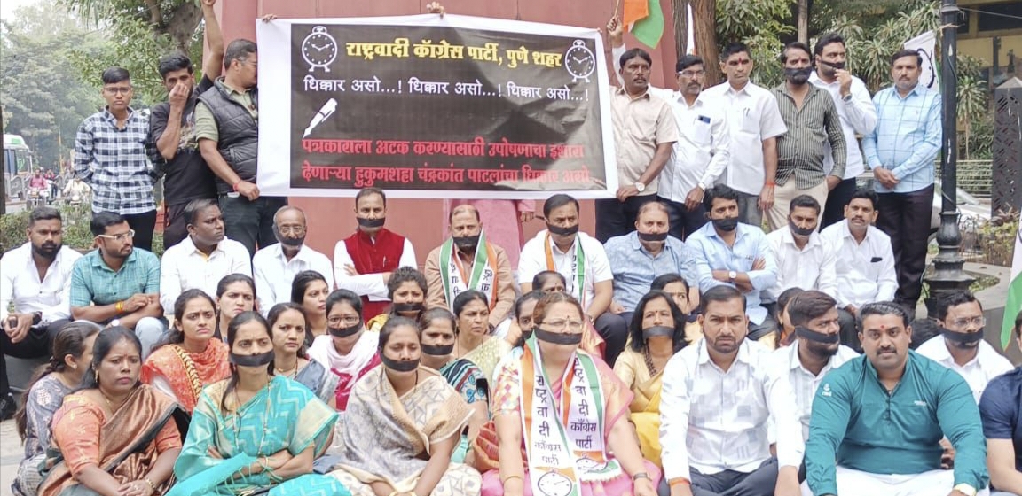 पुणे : घटनेचे वार्तांकन करण्याचे कर्तव्य बजावणाऱ्या पत्रकाराला अटक करण्याची मागणी करणारे पुण्याचे पालकमंत्री चंद्रकांत पाटील यांच्या विरोधात पुणे शहर राष्ट्रवादी काँग्रेसच्या वतीने मुक निदर्शने करण्यात आली.चंद्रकांत पाटील यांना सन्मति दे प्रार्थना यावेळी करण्यात आली.