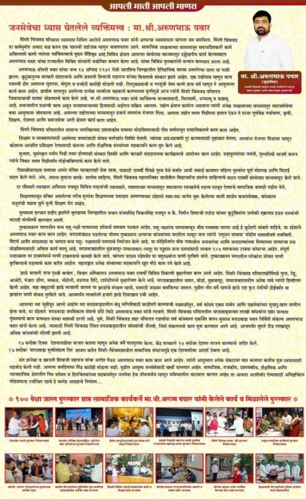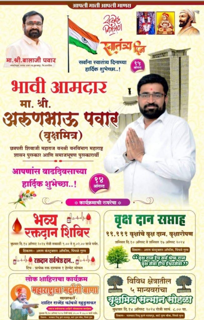 पिंपरी : छत्रपती शिवाजी महाराज वनश्री महाराष्ट्र शासन पुरस्कार प्राप्त, तसेच समाजभूषण पुरस्कार प्राप्त वृक्षमित्र, भावी आमदार अरुण पवार यांच्या वाढदिवसानिमित्त बुधवारी १४ ऑगस्ट रोजी विविध सामाजिक कार्यक्रमांचे आयोजन करण्यात आले आहे.
