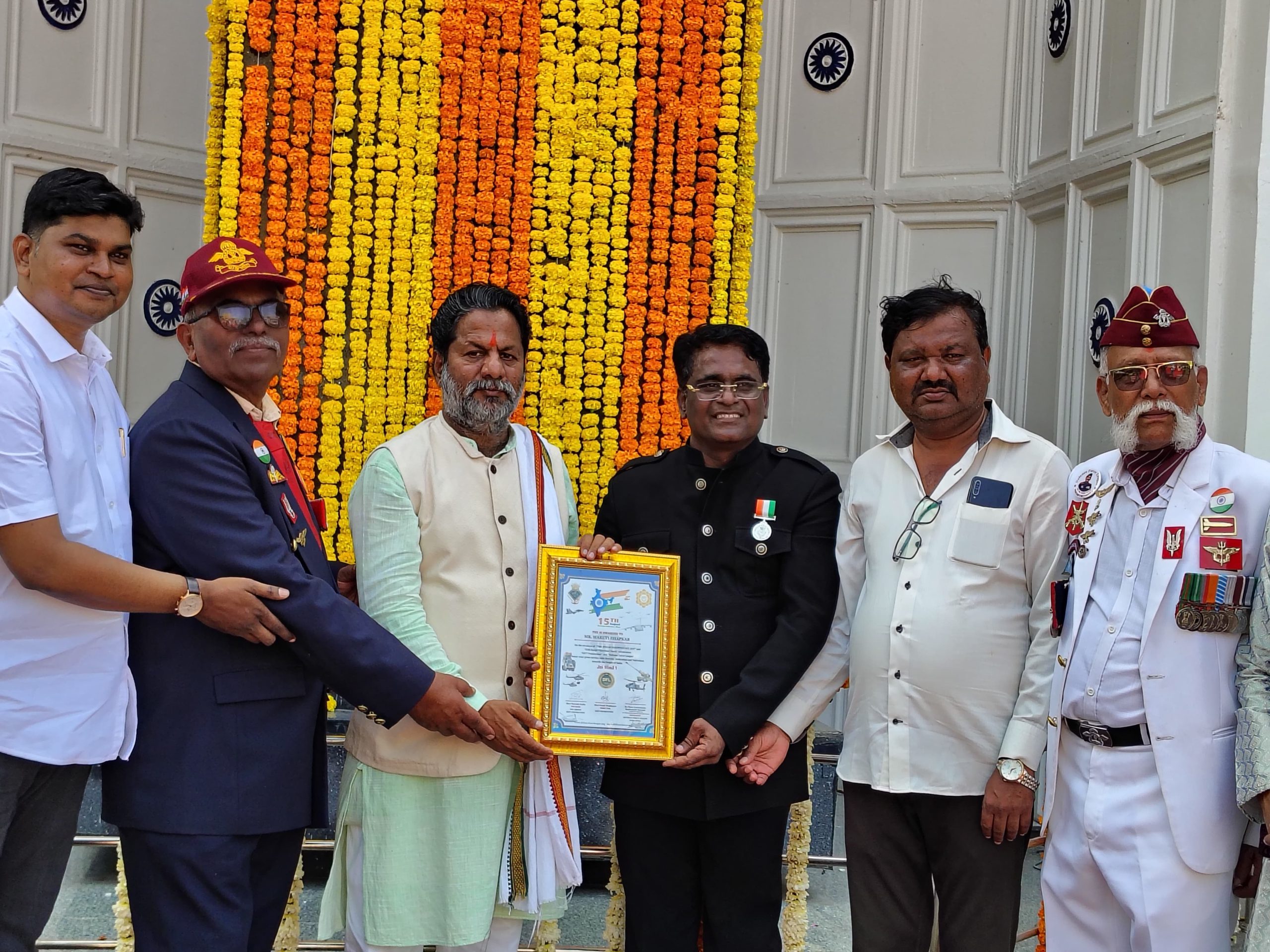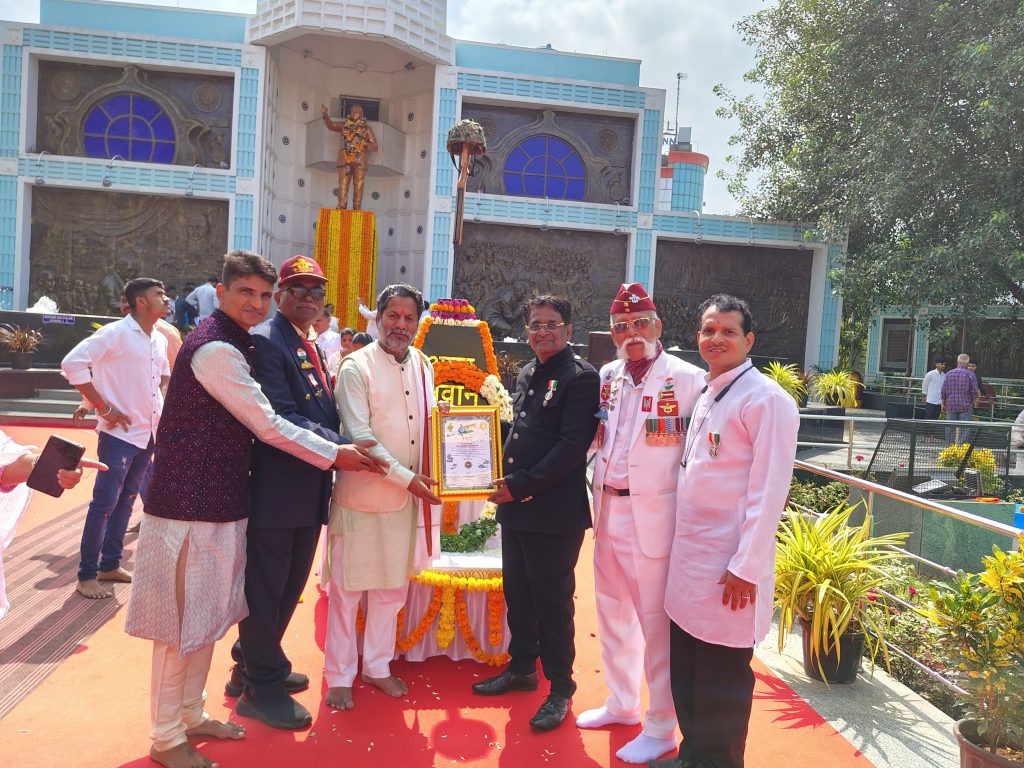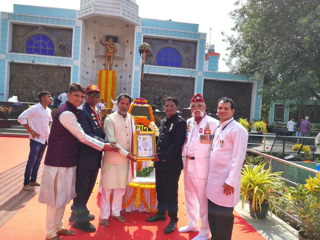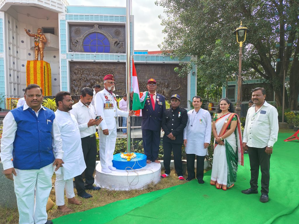 प्रसंगी पूर्व सेनानींचा हस्ते महापालिकेतील जनसंपर्क अधिकारी प्रफुल्ल पौराणिक, कनिष्ठ अभियंता चंद्रकांत कुंभार, उद्यान विभागातील राजेश वसावे,
