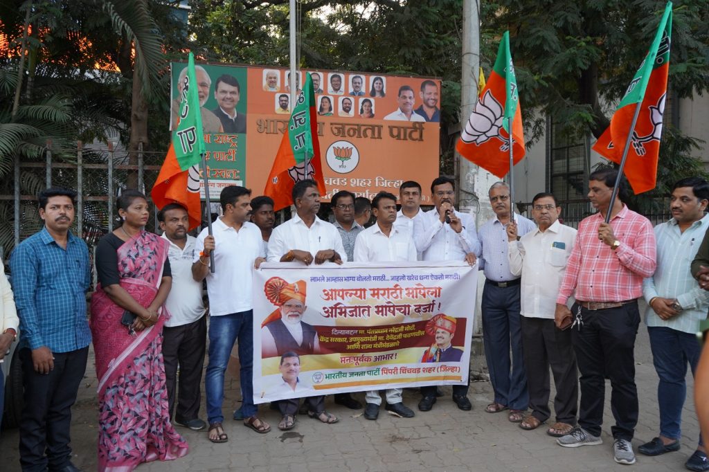 पिंपरी, दि. ४ ऑक्टोबर – पंतप्रधान नरेंद्र मोदी यांच्या अध्यक्षतेखाली केंद्रीय मंत्रिमंडळाची काल (गुरुवारी) महत्त्वाची बैठक पार पडली. या बैठकीत मराठी भाषेला अभिजात दर्जा देण्याचा महत्वपूर्ण आणि ऐतिहासिक निर्णय घेण्यात आला.या ऐतिहासिक निर्णयाचे स्वागत करण्यासाठी पिंपरी चिंचवड भाजपचे शहराध्यक्ष शंकर जगताप यांच्या मार्गदर्शनाखाली भाजपचे पदाधिकारी व कार्यकर्त्यांनी मोरवाडी येथील भारतीय जनता पक्षाच्या मध्यवर्ती कार्यालयाजवळ एकत्रित येत मिठाई वाटून आनंदोत्सव साजरा केला. यावेळी पदाधिकाऱ्यांनी ‘मी मराठी, आम्ही मराठी’, अशा घोषणांनी परिसर दणाणून सोडला. याप्रसंगी माजी सत्तारूढ पक्षनेते नामदेव ढाके, सरचिटणीस संजय मंगोडेकर, रवी देशपांडे, प्रदीप बोन्द्रे, मंडलाध्यक्ष राजेंद्र बाबर, सोमनाथ भोंडवे, योगेश चिंचवडे, भगवान निकम, प्रसन्न अष्टेकर, विजय शिनकर, कोमल शिंदे, ऍड. दत्ता झुळूक, महेंद्र बाविस्कर, महेश बालकवडे, राकेश नायर, मंडलाध्यक्षा पियुषा पाटील, दीपक भंडारी, जनार्धन तालेरे, निलेश जगताप, सचिन बंडी, दीपाली बेलसरे आदी पदाधिकारी व कार्यकर्ते मोठ्या संख्येने उपस्थित होते.यावेळी बोलताना नामदेव ढाके म्हणाले की, या ऐतिहासिक निर्णयाचे खरे श्रेय महाराष्ट्रातील संत परंपरेला आहे. ज्यांनी आपल्या ग्रंथ, पोथी, ओव्या आणि वाड्मयाद्वारे रचलेल्या “माझा मराठाचि बोलु कौतुके। परि अमृताते ही पैजा जिंके।” या शब्दांमधून मराठी भाषेविषयी असलेले प्रेम आणि अभिमान प्रत्येक मराठी जनांमध्ये रुजविला. त्यांच्या या योगदानामुळेच आज आम्हाला या ऐतिहासिक दिवसाचा साक्षीदार होता आले. हा निर्णय घेतल्याबद्दल पंतप्रधान नरेंद्र मोदी आणि केंद्र सरकारचे मनापासून आभार.