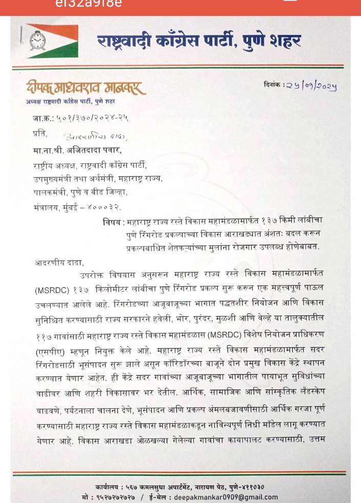 राष्ट्रवादी काँग्रेस पार्टी शहराध्यक्ष श्री. दीपक मानकर यांनी महाराष्ट्र राज्य रस्ते विकास महामंडळामार्फत तयार करण्यात येणाऱ्या १३७ किमी लांबीचा पुणे रिंगरोड प्रकल्पाच्या विकास आराखड्यात अंशत: बदल करून प्रकल्पबाधित शेतकरी व त्याच्या कुटुंबीयांना रोजगार उपलब्ध व्हावे यासाठी राष्ट्रवादी काँग्रेस पार्टी राष्ट्रीय अध्यक्ष, उपमुख्यमंत्री तथा अर्थमंत्री, पालकमंत्री नामदार अजितदादा पवार, व्यवस्थापकीय संचालक-महाराष्ट्र राज्य रस्ते विकास महामंडळ, आयुक्त- पुणे महानगर क्षेत्र विकास प्राधिकरण यांना निवेदन देत मागणी केली.