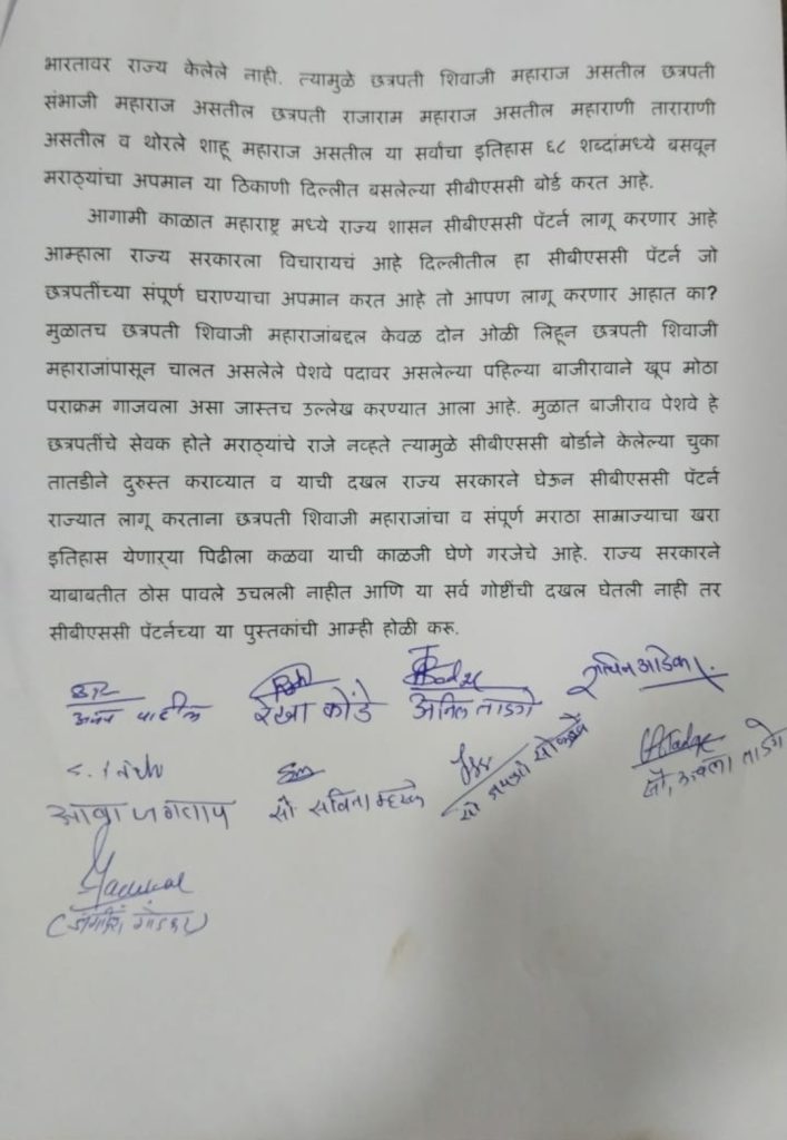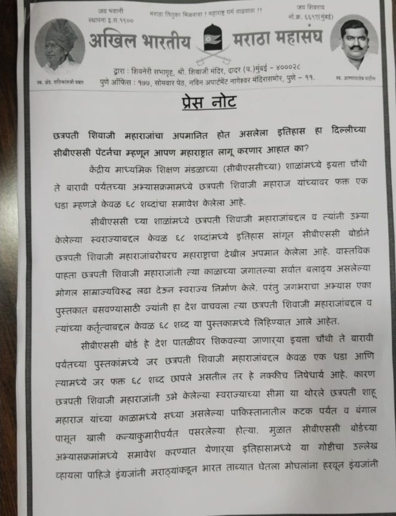 CBSC च्या केंद्रीय माध्यमिक शिक्षण मंडळाच्या शाळांमध्ये इयत्ता चौथी ते बारावी पर्यंतच्या अभ्यासक्रमामध्ये छत्रपती शिवाजी महाराजांच्या वर फक्त एक धडा आणि तोही 68 शब्दांचा खरंच छत्रपती शिवाजी महाराजांचे स्वराज्याबद्दलचे काम फक्त 68 शब्दांमध्ये मांडणे म्हणजे छत्रपती शिवाजी महाराज सोबतच महाराष्ट्राचा अपमान करण्याचं काम केल आहे. हे पुस्तक देशपातळीवर शिकवल्या जाणार आहे. यासाठी अखिल भारतीय मराठा महासंघाच्या वतीने या पुस्तकाचा संदर्भात अखिल भारतीय मराठा महासंघाने निषेध व्यक्त केला आहे. 68 शब्दात महाराष्ट्राचा आणि छत्रपती शिवाजी महाराजांचा इतिहास मांडणे म्हणजे चक्क दिल्ली सीबीएससी पॅटर्न महाराष्ट्राचा अपमान केला आहे तसेच येणाऱ्या काळामध्ये हे सीबीएससी पॅटर्न संपूर्ण महाराष्ट्रात राज्य सरकार लागू करणार आहे. यासाठी मराठ्यांचा इतिहास मेरा पिढीला समजणे आवश्यक आहे यासाठी अखिल भारतीय मराठा महासंघ या गोष्टीचा निषेध करून येणाऱ्या काळामध्ये या संदर्भात ठोस पावले उचलणार आहेत असा इशारा पत्रकार परिषदेत अखिल भारतीय मराठा महासंघाच्या वतीने पुणे येथे देण्यात आला.