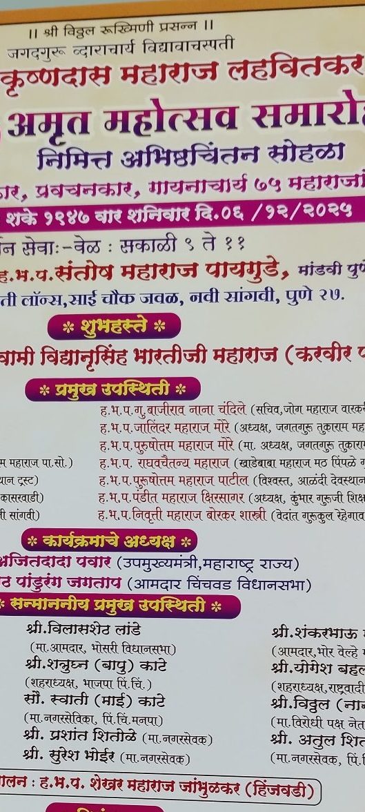 पिंपरी-चिंचवड : पिंपळे गुरव येथील कै. गणपतराव जगताप प्रतिष्ठान आणि महाराष्ट्र राज्य वारकरी महामंडळ पिंपरी चिंचवड यांच्या संयुक्त विद्यमाने जगदगुरू व्दाराचार्य विद्यावाचस्पती डॉ. रामकृष्णदास महाराज लहवितकर यांच्या अमृत महोत्सवी वर्षानिमित्त एका भव्य अभिष्टचिंतन सोहळ्याचे आयोजन करण्यात आले आहे.